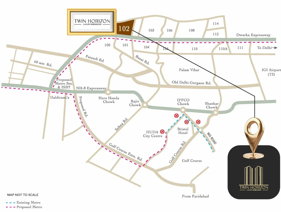 HCBS Twin Horizon Sector 102 Gurgaon is strategically located close to Dwarka Expressway, providing seamless connectivity to Delhi, IGI Airport, NH-8, and major corporate hubs.