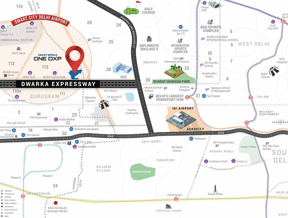 Smart World One DXP Sector 113 Gurgaon is strategically located on the outskirts of Delhi, adjacent to the Smart World One DXP Dwarka Expressway. This prime location offers seamless connectivity to South and Central Delhi, Indira Gandhi International Airport, and the upcoming Diplomatic Enclave. With easy access to NH-8, the future metro line, and key business hubs in Gurgaon, Smart World One DXP Gurgaon is ideal for professionals and frequent travelers.